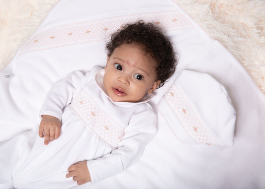 A perfect companion for naps, stroller rides, or cuddles, this blanket is a must-have for your baby’s essentials. Pair it with our Handmade Smocked Ari Footie and Handmade Smocked Ari Hat for a matching set that displays elegance and comfort.