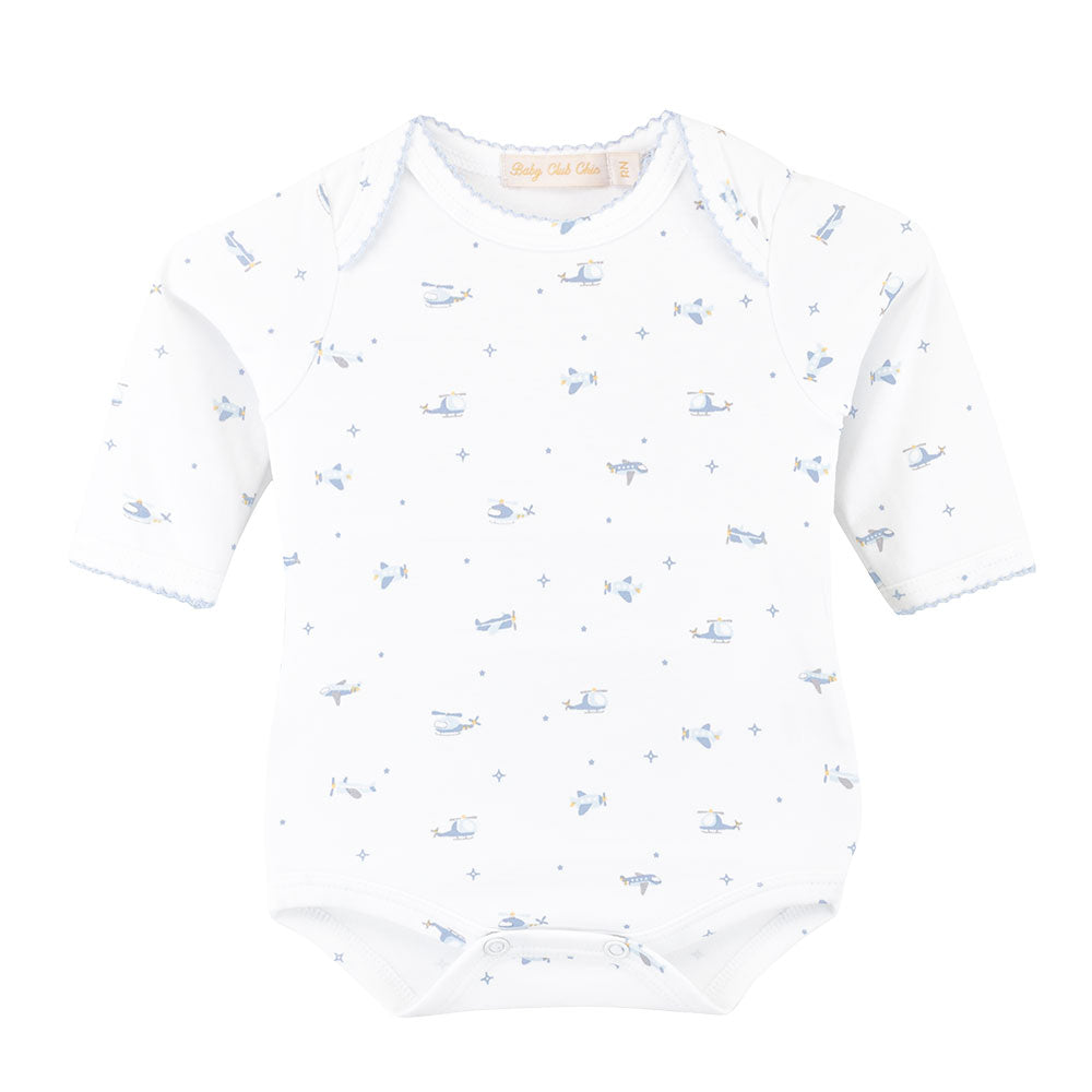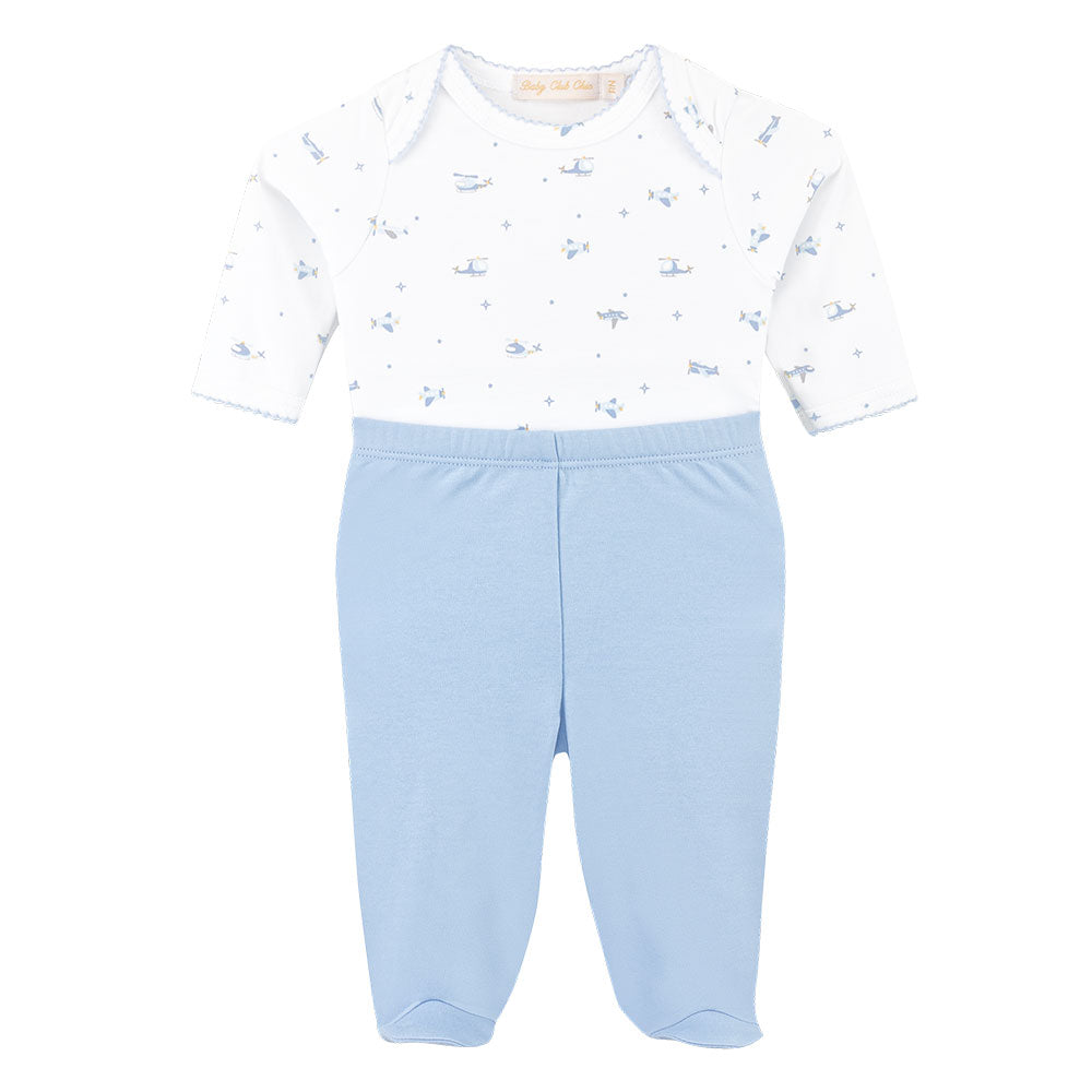 A beautiful essentials set for any little one. Crafted from premium Pima cotton, this 3-piece set includes a blue bodysuit, pants, and a bib. Soft, breathable, and versatile. A thoughtful gift for your baby.