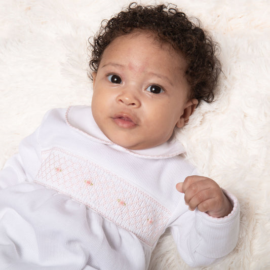 Regular price $63.00Regular priceUnit price / perSale price $63.00A timeless essential for your baby girl, combining heirloom-quality craftsmanship with everyday comfort. Featuring delicate hand-smocked flowers and intricate detailing, this footie embodies elegance and charm.