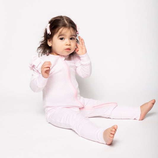 Regular price $47.00Regular priceUnit price / perSale price $47.00Wrap your little one in the whimsical charm of our Pink Bunnies Zipper Romper with Ruffles. Featuring an adorable bunny print complemented by sweet ruffles, this romper is as delightful as it is comfortable. Crafted from 100% Peruvian Pima cotton, it ensures a gentle touch against your baby's delicate skin.